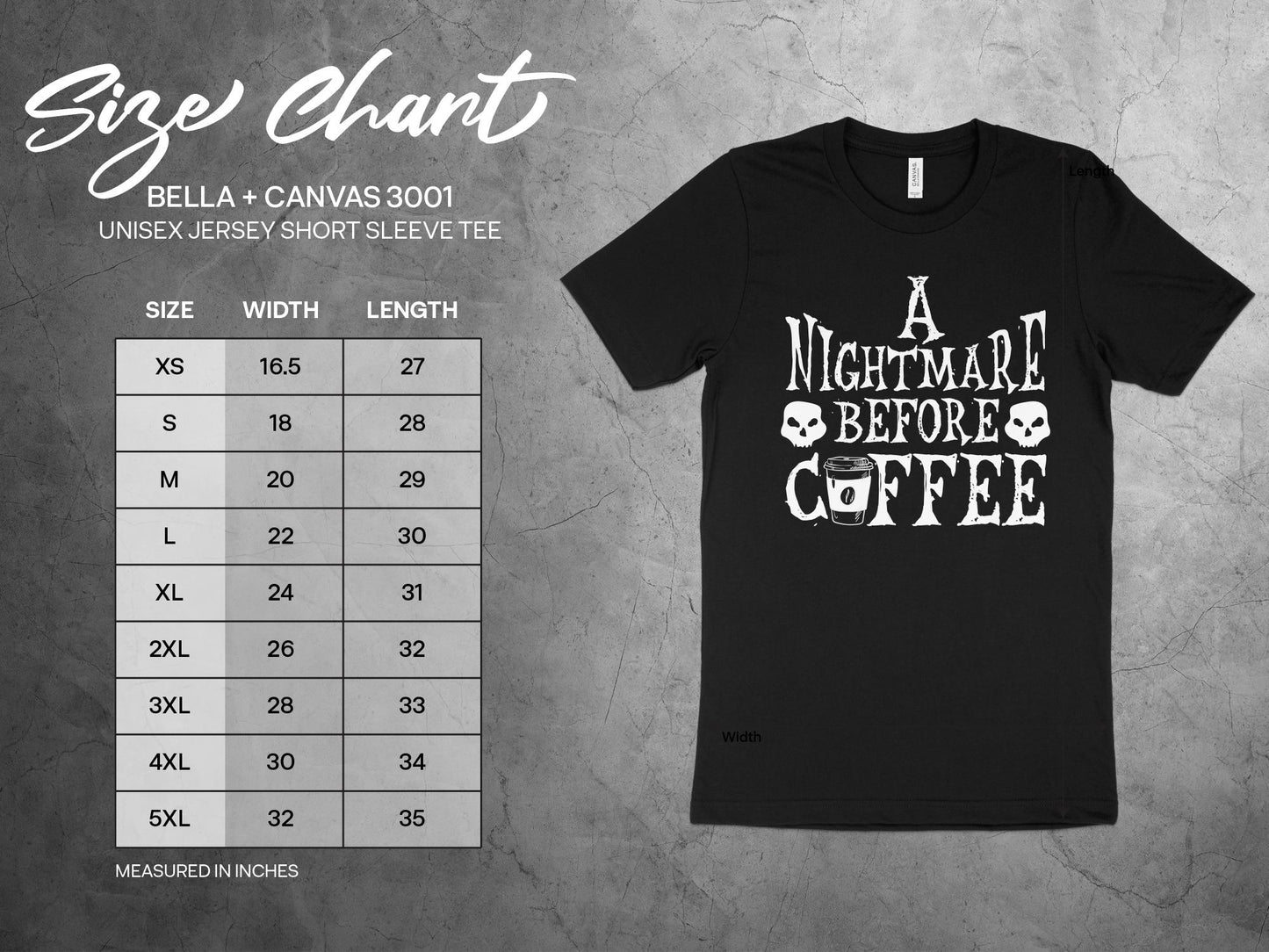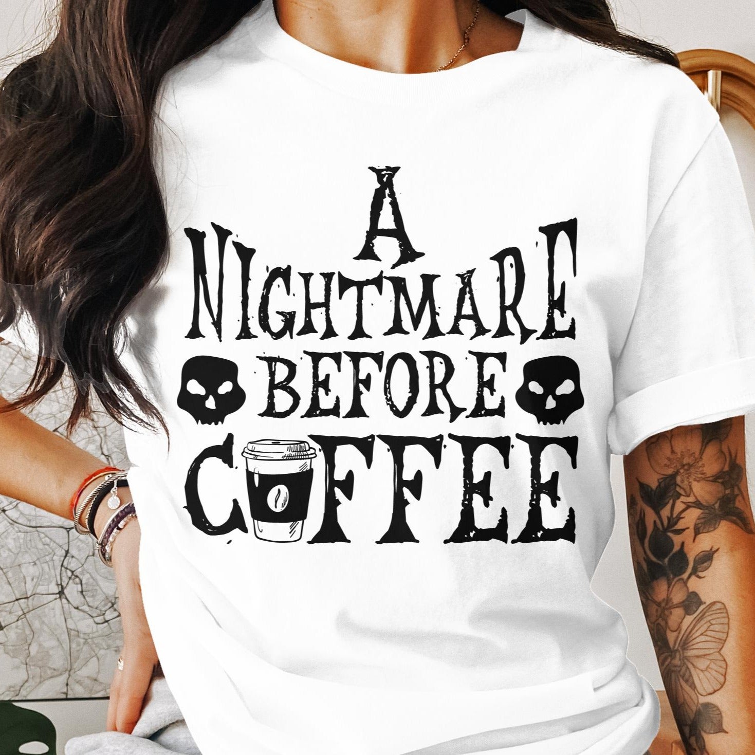 Crafted from the finest quality materials, this shirt offers unmatched comfort. Its softness against the skin, paired with the hauntingly delightful "Nightmare Before Coffee" phrase, makes it an ideal choice for both Halloween aficionados and coffee lovers.