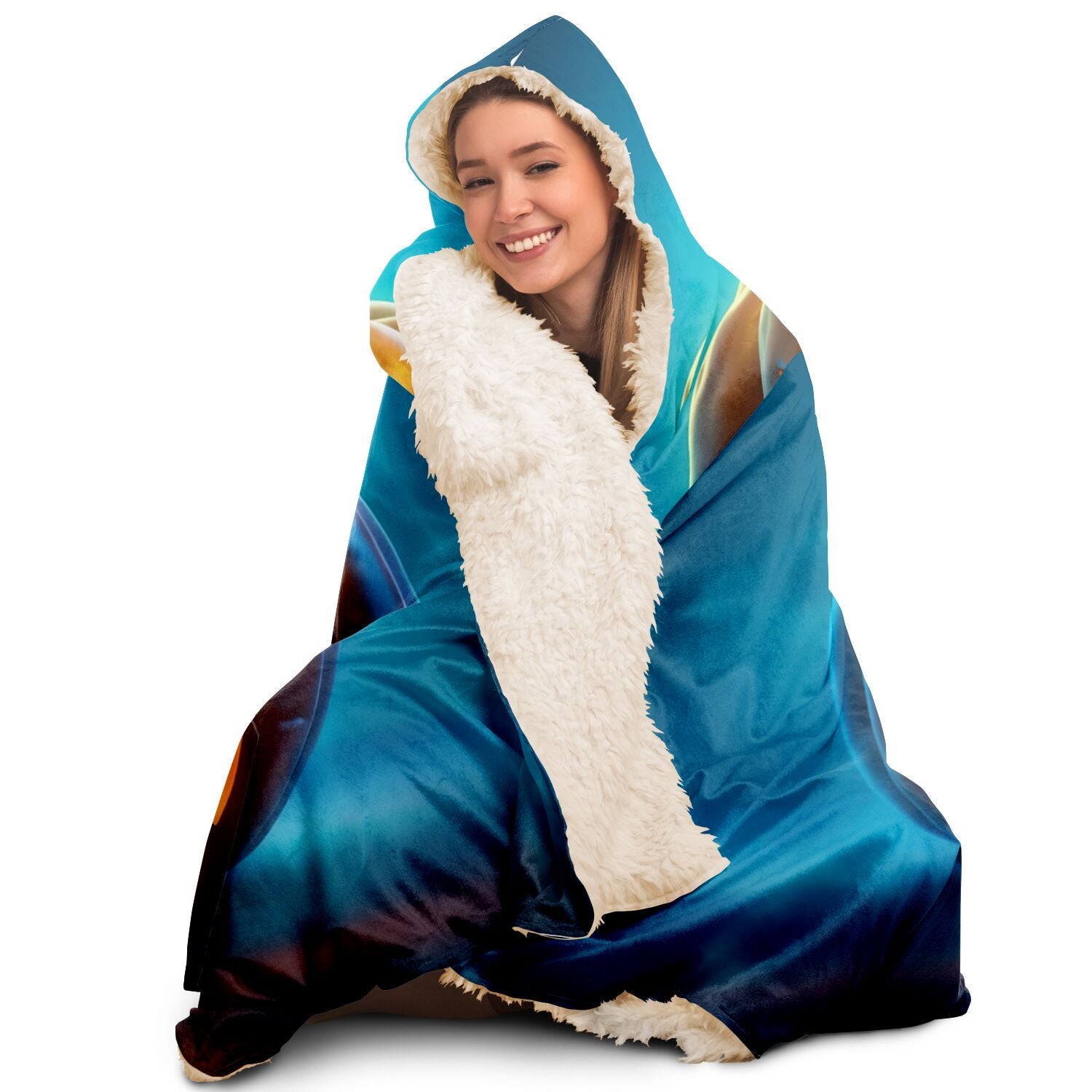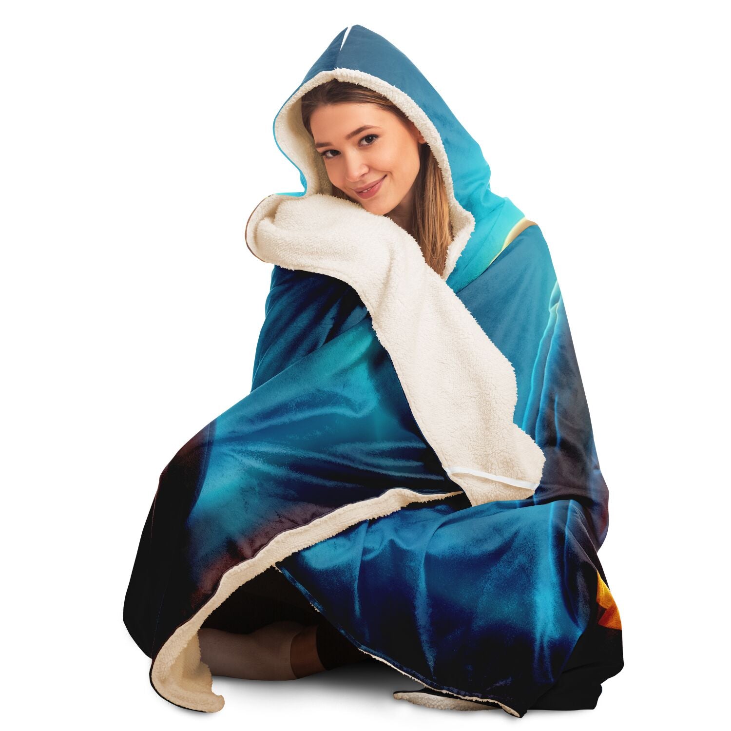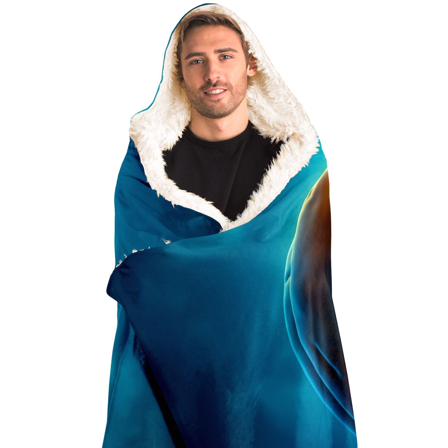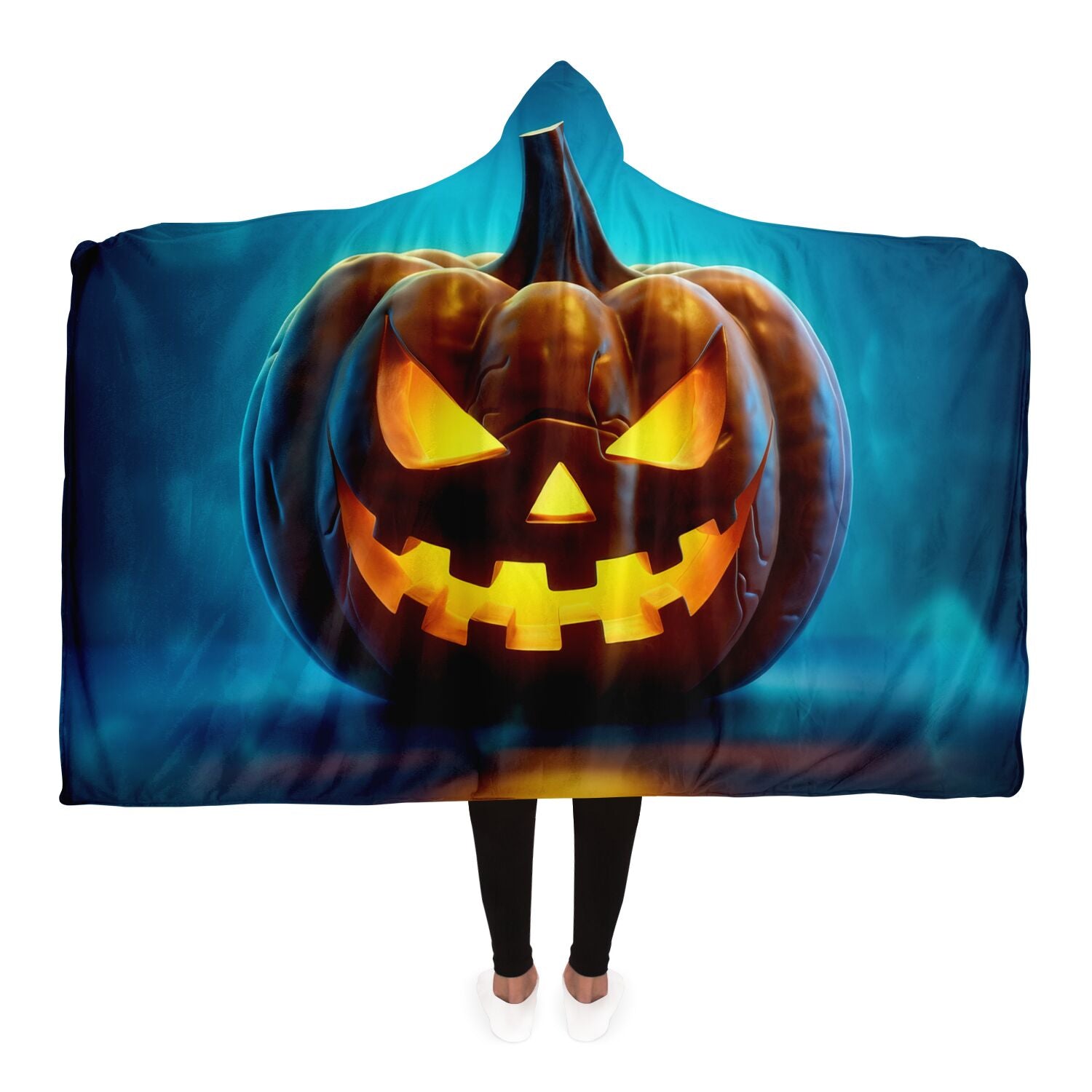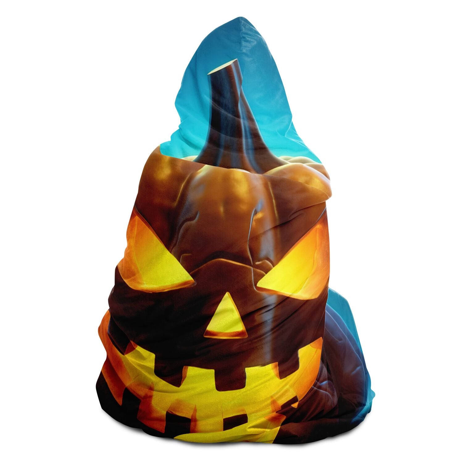 Envelop yourself in an aura of enchantment with our Hooded Blanket, featuring a captivating eerie pumpkin set against a backdrop of mesmerizing blue mystique. This isn't just a blanket; it's a portal to comfort and fantasy.
