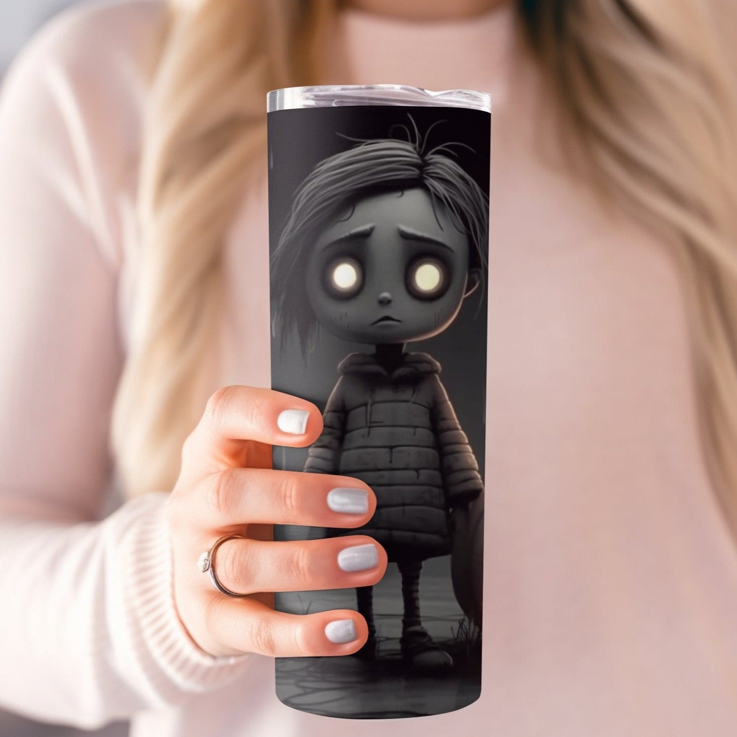 Dive into the world of eerie enchantment with our 20 oz sublimation tumbler, the perfect vessel for your chillingly delightful beverages. Unveil the mystery and indulge in your favorite drinks as you embrace the hauntingly captivating design that graces this tumbler.